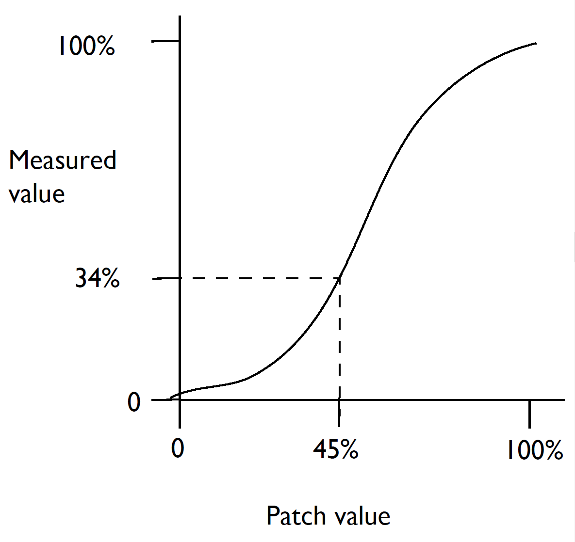 This graph is what you can see in the Calibration Edit dialog of the GUI version of the RIP. The dotted line shows that a Patch value of 45% produces a Measured value of 34% in this example. The shape of the graph depends on the measurement system chosen.