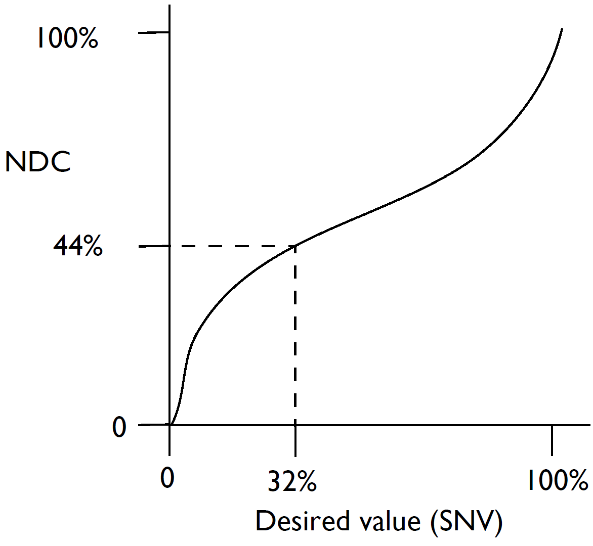 In summary, if a job using this calibration asks for a tint of 32%, the NDC sent to the printer ise 44%.