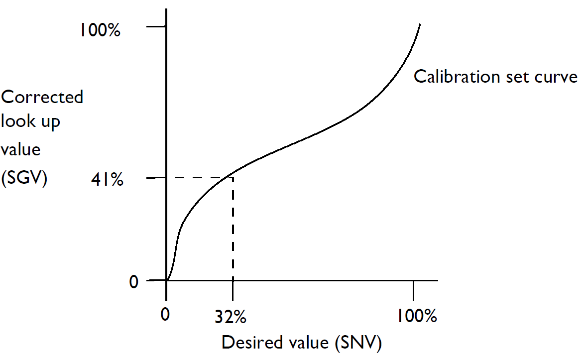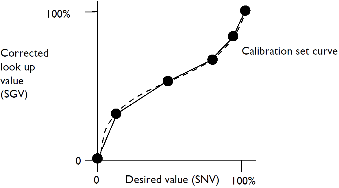 In the dictionary form of the calibration set, the interpolation arrays can themselves consist of two arrays. In this case the first array relates SNV to SGV value and the second array relates SGV to NDC, see Colorant subdictionaries (N-color calibration). If there is only one array present, it effectively relates SNV to NDC values.