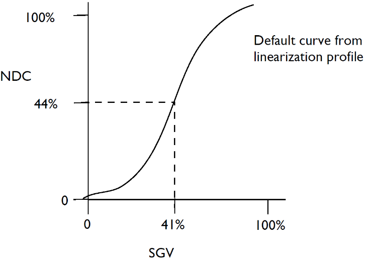 Now the default curve for the output device is applied. The default curve comes from the profile of the output device and is applied to the SGV found from the calibration set curve. This gives an NDC which is the actual value the RIP must supply to the printer.