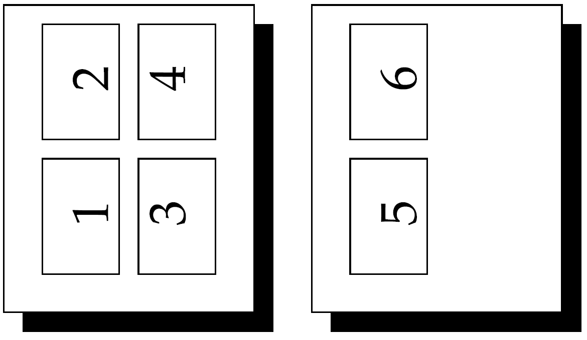 First, an example where one multi-page job is placed four pages per output page, each page half-size and rotated 90 degrees. Because our example control job repeats itself so long as there are more pages, it does not matter how many pages are in the job.