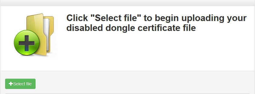 Click the Select File button; this allows you to select the .txt file created with the Disable Dongle Tool. A file dialog is displayed that you can you use to navigate to your certificate.