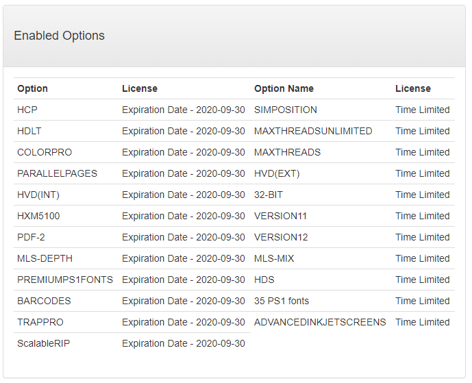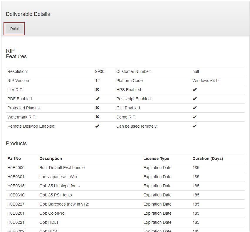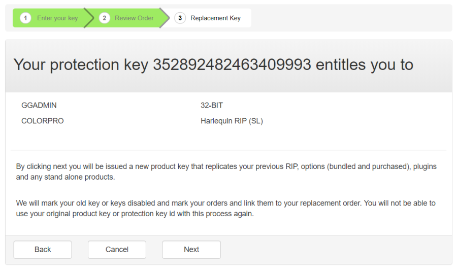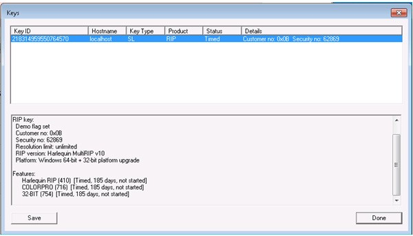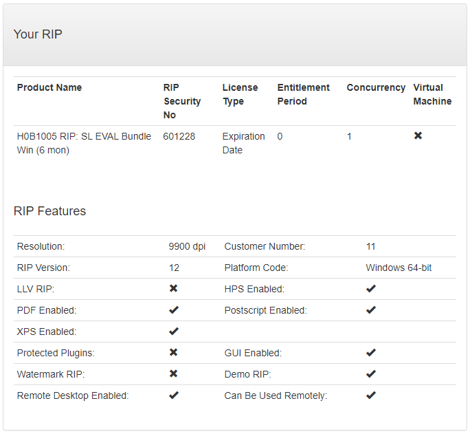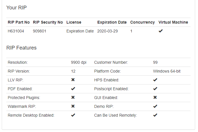 Your Protection Key details are retrieved from the licensing server along with the details of the RIP and its related products: