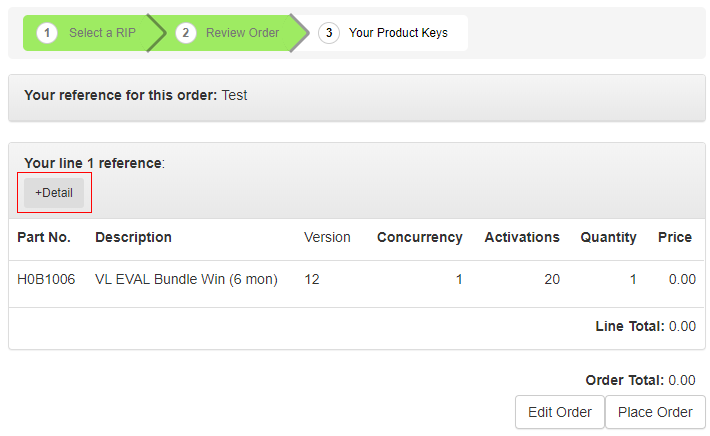 If you want to change the extension period, click the Edit button to return to the previous page. Selecting Cancel will return you to the start. Click the Place Order button to submit your order and generate the extension for your existing time limited license.