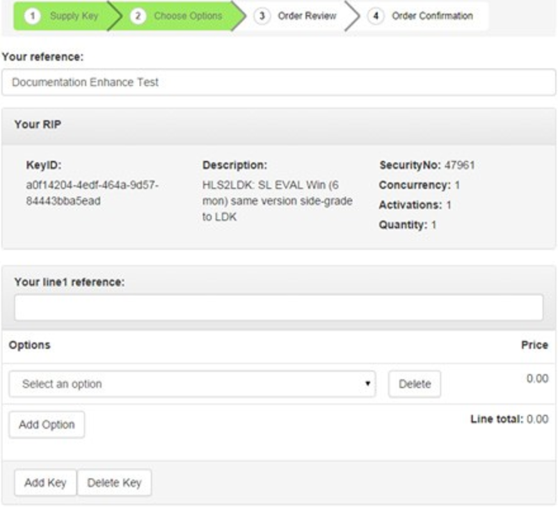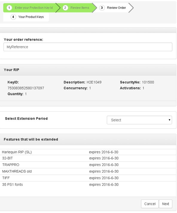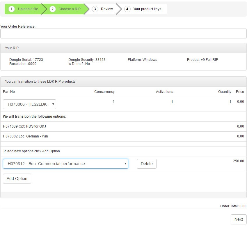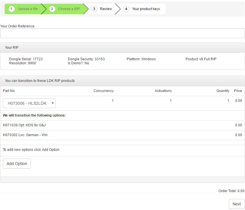 The ordering system will take your Protection Key ID or to derive your Protection Key ID from a Product Key if you provide one. Your Protection Key ID tells us what products are contained in your license, and we list them before you replace the license. When you click Next we will replace your license and disable your old one. The new license (your Product Key) preserves all of the attributes of your previous license including security numbers, duration, concurrency and so on.