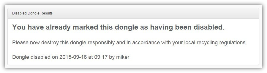 This completes the process. Note: If GGSL is not aware of the dongle or if the certificate is not valid, you will be notified after the file is uploaded. If the dongle has already been marked as destroyed, the ordering system will respond with: