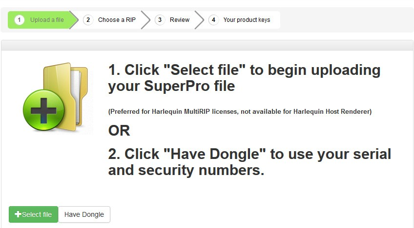 If you are moving a Harlequin Server RIP or MultiRIP from HLS to LDK, GGSL recommends that you use the GetDongleInfo tool, which is available when you install a new RIP. (See <installation folder>\ldk\getdongleinfo.exe.) Use GetDongleInfo to generate a .superpro file and then upload the file to us. See "Upload .superpro file walkthrough" below.