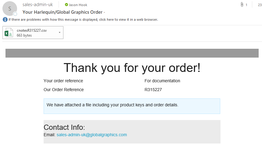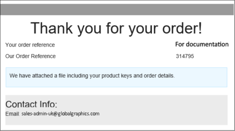 This page provides you with details of the Product Key for each item in your order, a summary of what you ordered and a link to a CSV file containing details of the order. You will also receive a copy of this file by e-mail. If you would like copies of this e- mail sent to other addresses (such as a group), please inform GGSL.