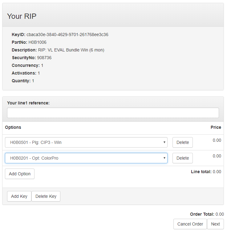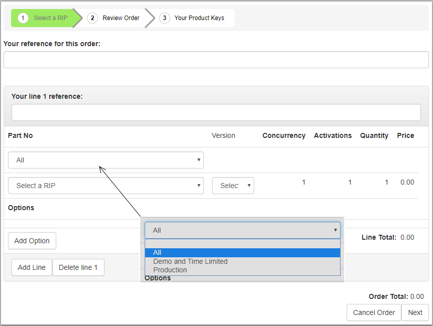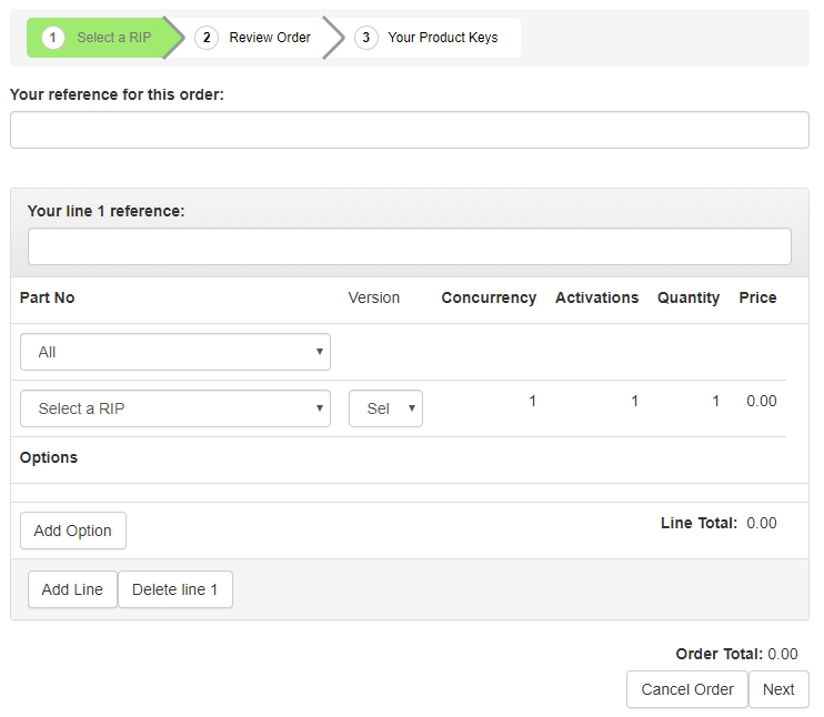 Add an order reference, a line reference (or both) and select a RIP option from the Part No. drop-down list. The RIP version field might include just the most recent version (typically for demo products) or a small selection of values.