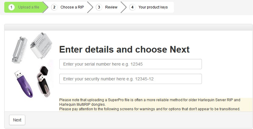 Enter the serial and security numbers from your dongle and click Next. The system attempts to match the dongle information against the records held by GGSL. It then returns the details about your RIP's capabilities and any options or companion products associated with your RIP.