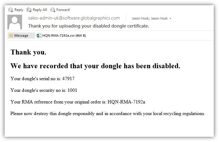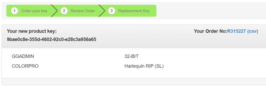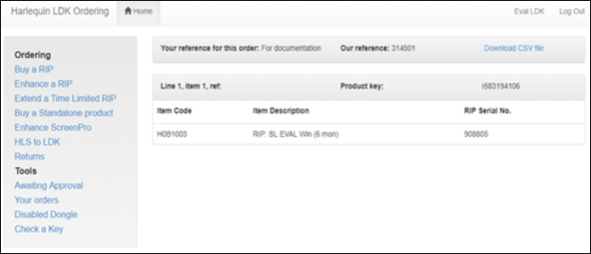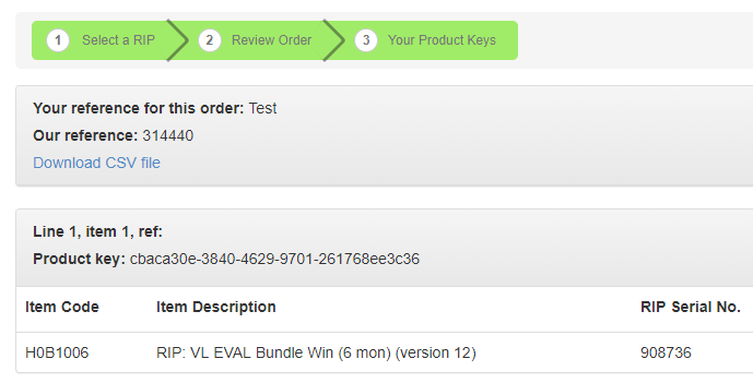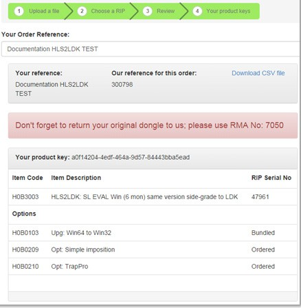 Your order is processed and your Product Key(s) and the RMA number for your Dongle return is displayed. A CSV file containing the order details can be downloaded from this page using the Download CSV file option, and a copy is e-mailed to you.