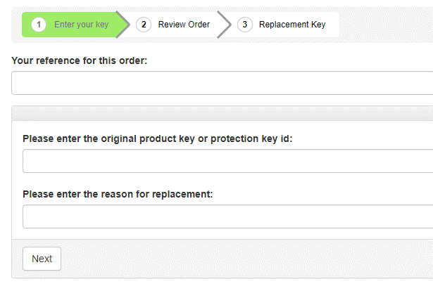 We ask you to supply as reference either a Product Key or a Protection Key ID and a brief description of why the license is to be replaced.