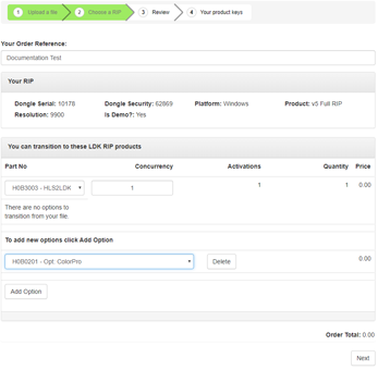 The ordering system provides a facility for transitioning Harlequin Server RIP or MultiRIP licenses using HLS security to LDK security. These are relevant for moving from a license for version 10 or earlier, to a license for version 10 or later (version 10 can be used with both security systems). The upgrade path in the ordering system is not applicable for any system using HLS permit files (usually used when more than one RIP is used on a single computer). Please contact GGSL Sales-Admin if you wish to upgrade such a license. There are two methods for providing GGSL with enough information to generate an LDK license from your existing HLS license: