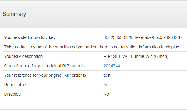 Use the Edit Order button to amend the order; click Place Order to submit your order which will complete by displaying the Order Confirmation page. Your Product Key or keys will be displayed; a link to the CSV file which also contains details of your order is included. A copy of the CSV file is also e-mailed to you. Note: After you generate a key, activate it. !worddavdb2b8587ea1e0148f67bfa9ac2460484.png|height=340,width=449!Figure 6.6 The Order Confirmation page with fulfilment details