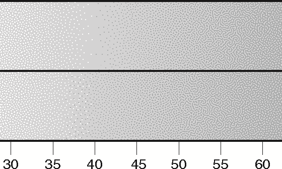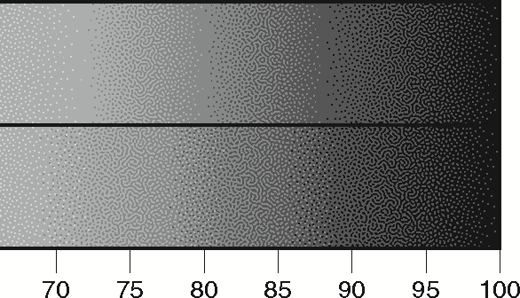 Note that while calibration can stretch and compress the color ranges to compensate for slight variations in the density gradient of the mixed screen, it cannot change the proportions of the two screens in an overlap. Therefore, choosing the rates of the two functions in the overlap is critical to achieving a smooth mix.