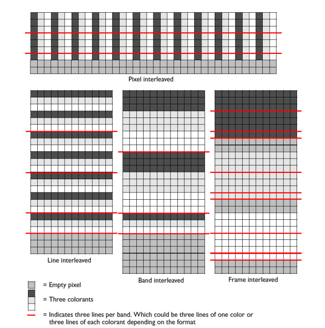 The different arrangement for pixel‐interleaved data emphasizes the way in which the data corresponds to the lines in the final image. Pixel-interleaved data , Band-interleaved and line-interleaved output and Frame-interleaved output discuss this in more detail.