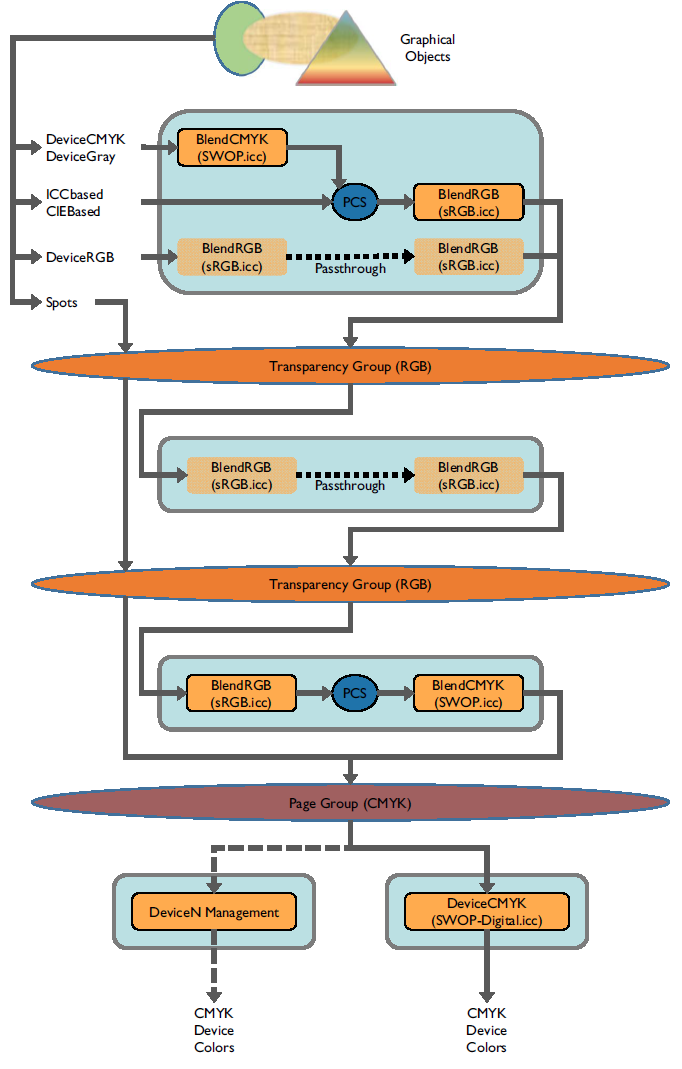 Figure: PDF Transparency Group Stack illustrates the color management of objects painted into a stack of two nested /DeviceRGB transparency groups within a /DeviceCMYK page group. With the exception of spots, colors are converted to each blend space in turn using the appropriate blend intercept profile. Colors pass through from one group to another when profiles match.