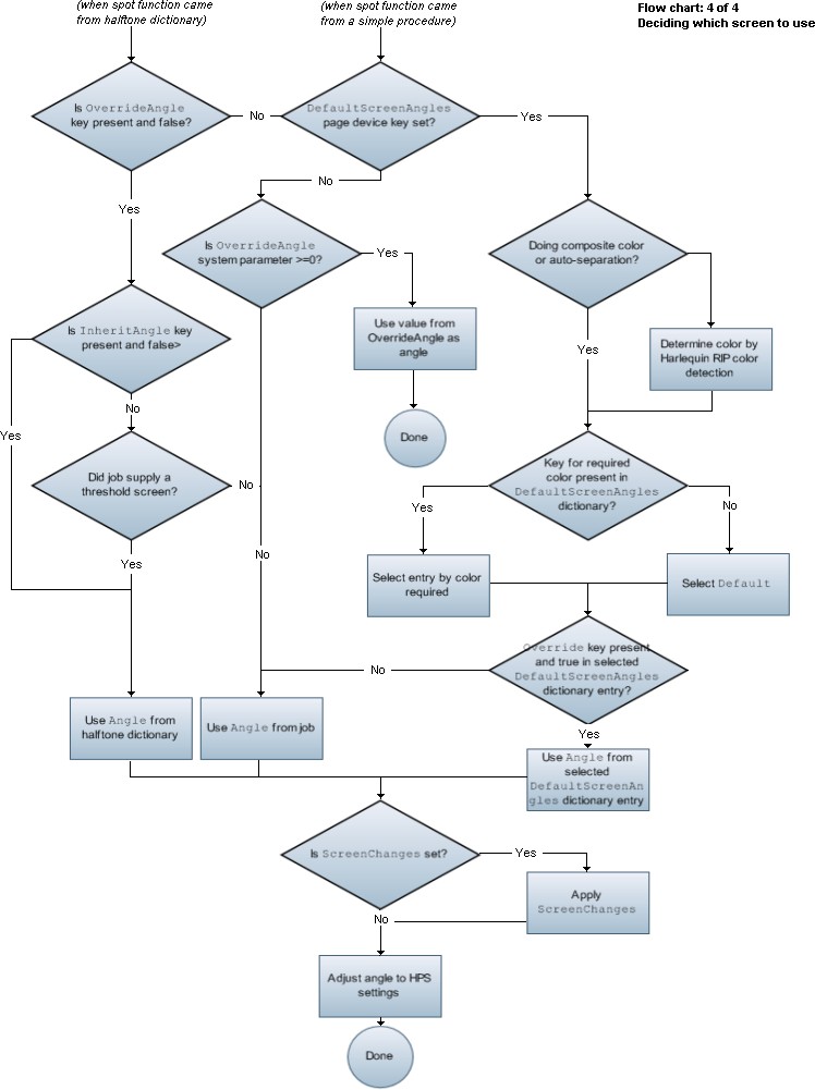 Angle is also determined from what is set by the job, or using the DefaultScreenAngles page device key (which provides a dictionary of angles keyed by color name - see (v13) Default screen page device keys ), or using the now deprecated OverrideAngle system parameter, according to the rules shown in the diagram. If appropriate, the angle is then adjusted slightly to account for HPS as just described for frequency.