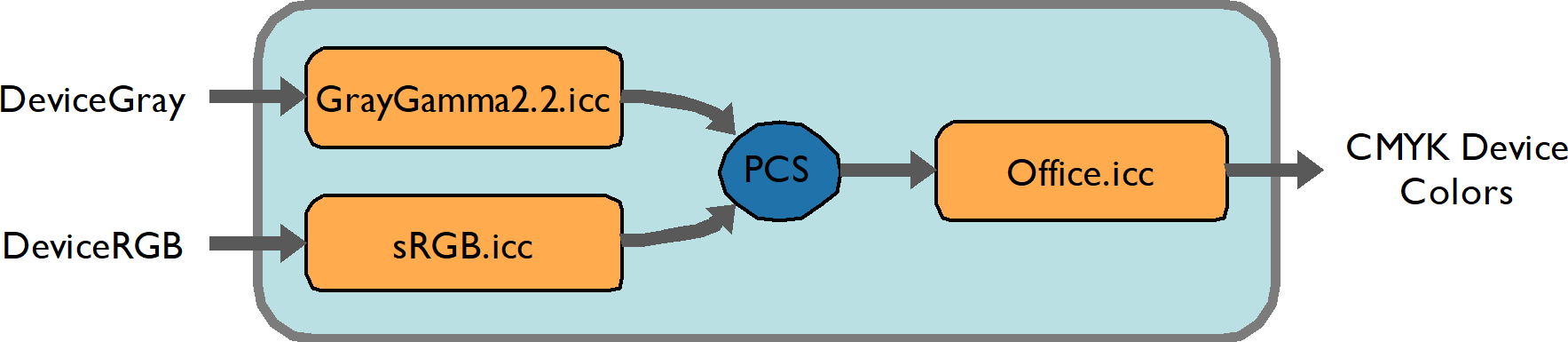 In office documents, /DeviceGray should often be treated as though they are /DeviceRGB. Again, this reflects the way jobs are constructed by printer drivers. To achieve this, /DeviceGray objects should be intercepted through a profile that behaves the way the RGB profile treats neutral colors. This example configuration is illustrated in Figure: Device gray interception for office printer: