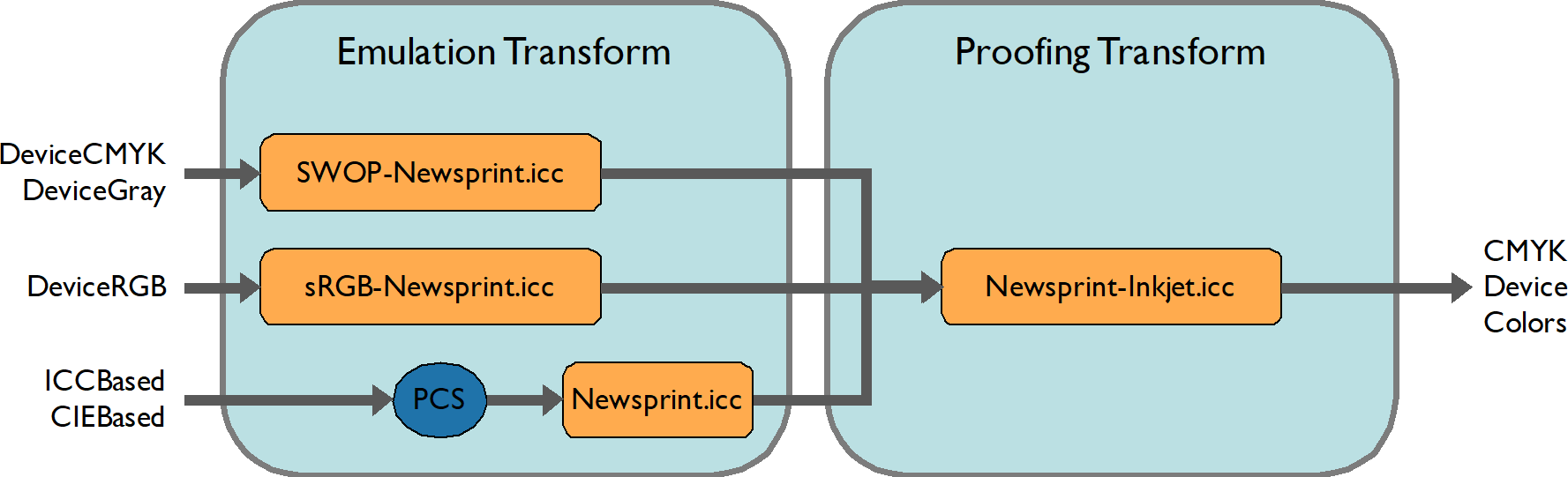 All /DeviceCMYK and /DeviceGray colors are first to be converted to the emulation color space using SWOP-Newsprint.icc. They are then converted to the output device using Newsprint-Inkjet.icc. Similarly, /DeviceRGB colors use the sRGB-Newsprint.icc and Newsprint-Inkjet.icc DeviceLink profiles.