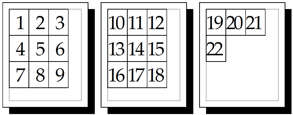 The EndPage procedure does most of the hard work here. In the normal case it increments the offset in x by the width of each input page until it would go off the right hand edge, at which point it resets to the left margin and increments in the y direction. When the page goes off the top (or actually off the bottom, since BeginPage is inverting it), we reset to the origin and print the page by returning true.