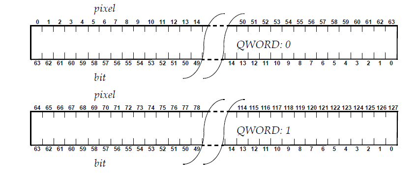 In a 64‐bit RIP each 64‐bit machine‐word (QWORD) in the raster has 64 bits of data, arranged with the left‐most raster bit/pixel at the most significant end of the QWORD (bit 63) and the right‐most raster bit/pixel at the least significant bit of the QWORD (bit 0), like this: