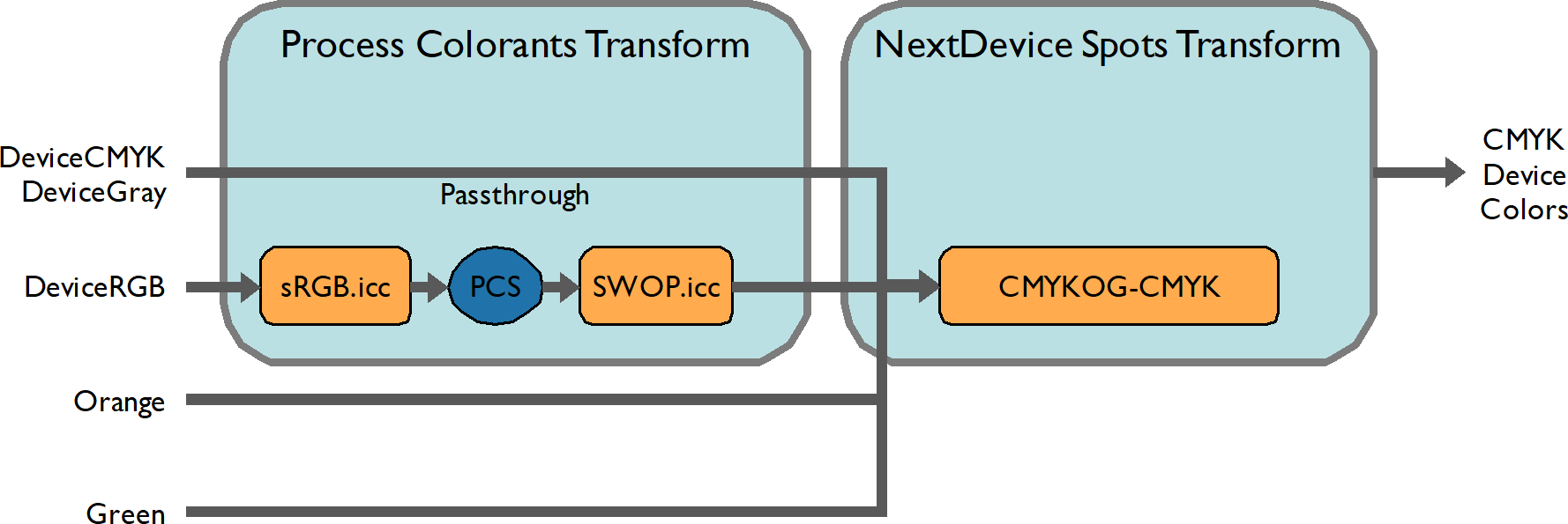If an NCD converts to a named colorant that is also one of the input components to a /NextDevice, this is also passed directly to the /NextDevice. For example, if the above configuration is used in conjunction with a named colorant (Gold), which is present in an NCD which converts to Separation (Orange), the Orange component is sent directly to the CMYKOG-CMYK CMM custom color space.