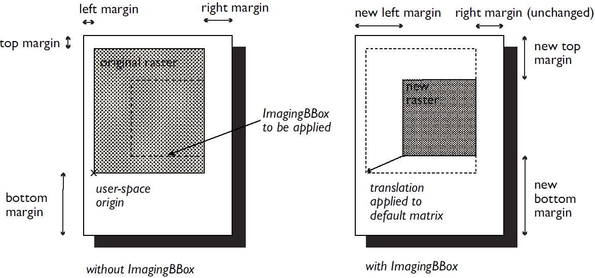The area identified by ImagingBBox is affected by media auto-rotation and fitting, Orientation, MirrorPrint, Scaling, and PDF's UserUnit.