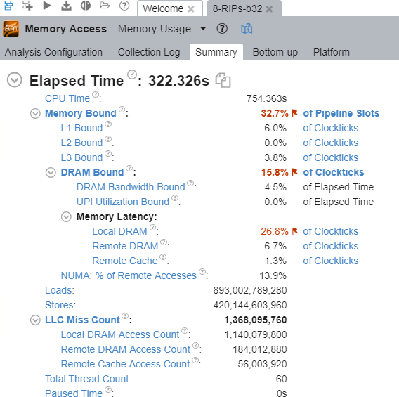 Figure: VTune memory access analysis: Eight RIPs - band height 32, four render threads