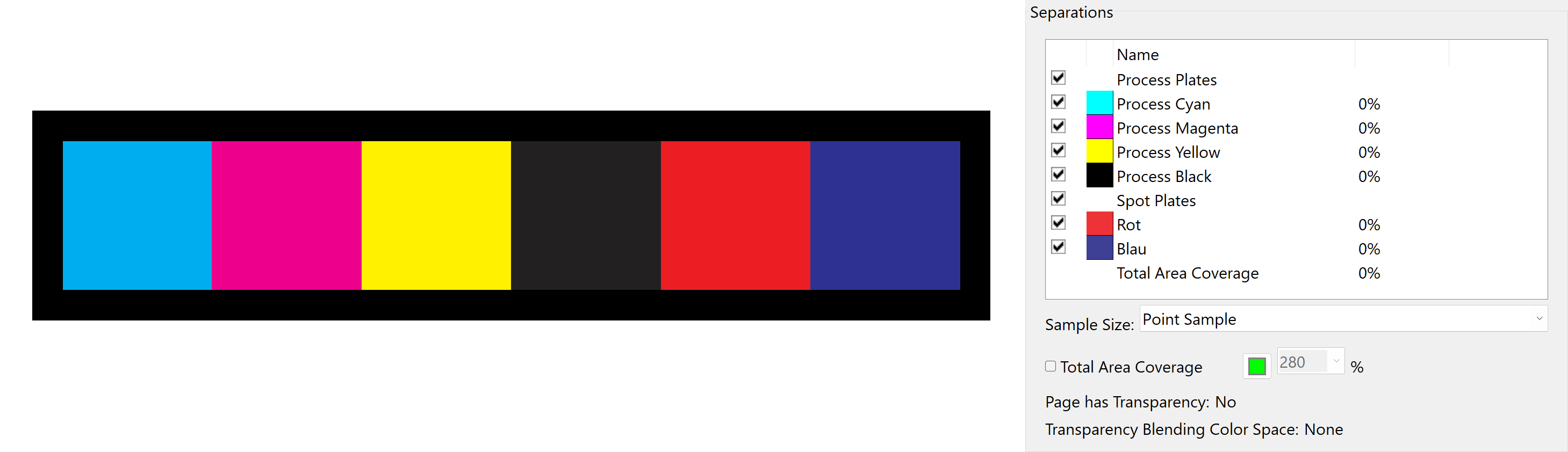 After opening the Print Preview panel, the process and spot colors are listed. Note that the All colorant is not listed with the other spot colors. Acrobat and other PDF renderers such as Mako recognize the colorant names All and None and treat them differently, as described above.
