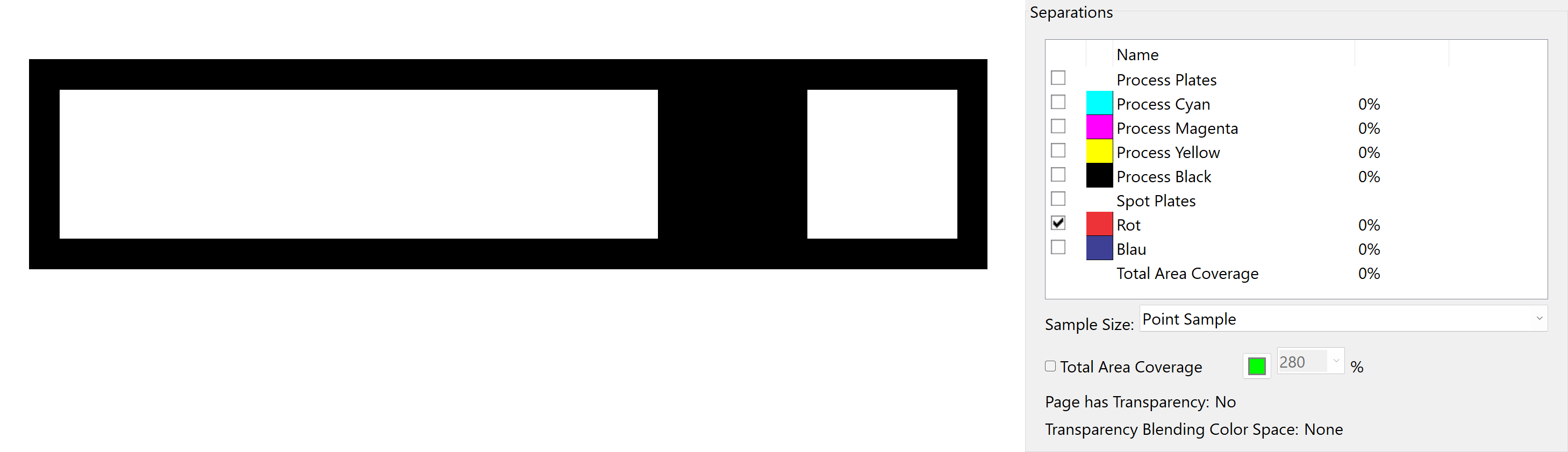 Next, we turn off the process colors and the second spot color. The graphic is not shown in its color, because when Acrobat displays a single separation in this view, it shows it in grayscale. The first spot color remains, and the All colorant is also drawn on the Rot separation. This may seem counter-intuitive, as the All colorant is defined only in terms of CMYK. However, the PDF spec says All paints on all separations, thus the result you see here.