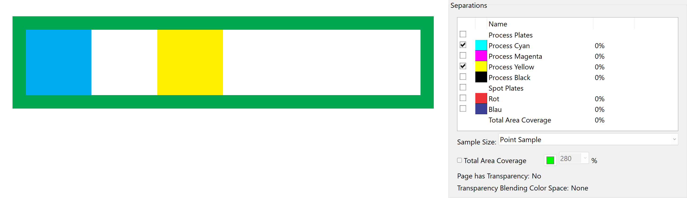 This final image shows the effect of showing the Cyan and Yellow plates only. When Acrobat displays more than one separation in this view, it shows them in their own color. As before, the All colorant is drawn on these separations, and mixes to produce green.