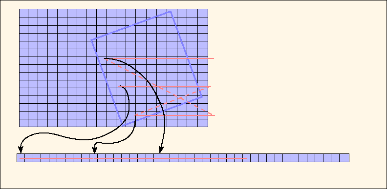 Consider that Jaws has to fill a row of pixels. The starting pixel in the row is mapped from raster co-ordinates to halftone co-ordinates, and the threshold which is closest to the pixel centre is used to color that pixel. The spot function sample point which originally gave rise to this threshold is at most 1/4 pixel in x and y from the pixel centre. Subsequent pixels in the row are colored from every fourth threshold on the same row of the threshold array. When the coloring reaches the right hand edge of the threshold array, Jaws must execute a "knight's move" back into the array to find the next threshold value to use.