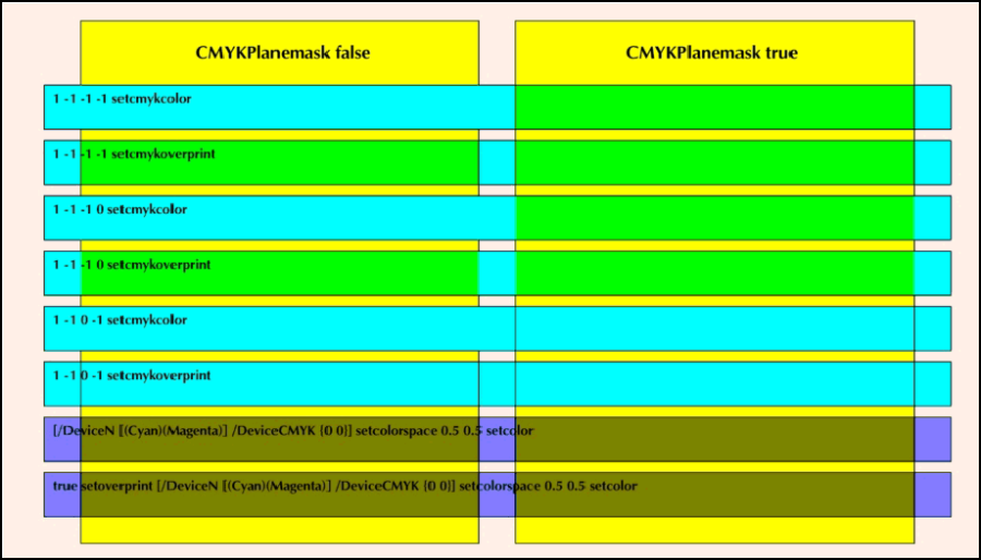 The behavior of overprinting may be affected by the value of the UseCIEColor page device parameter. When UseCIEColor is set to true, the setcmykoverprint operator behaves in the same way as setcmykcolor, and does not cause any overprinting.