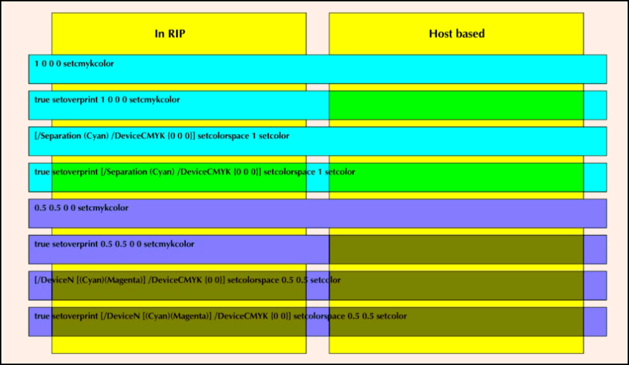 Normally, there is no conflict between "in-RIP separation" and "pre-separated" styles of output. Both take a PostScript language file representing a color document, and produce a series of monochrome pages of output, which may be printed with different colored inks and combined to produce printed color output. However, both styles of output use the setoverprint operator in different, and incompatible, ways.