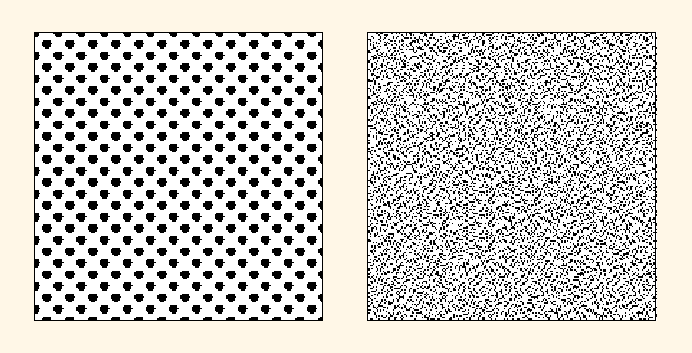 Jaws also includes a built-in method for dispersed dot screening that generates the threshold arrays on the fly. The halftones that Jaws generates in this way have more low-frequency content than those generated by off-line tools, which can lead to more visible artefacts, particularly in large areas of constant color. However, unlike halftones generated from fixed threshold arrays, the patterns produced do not repeat evenly across the page. The repetition produced by fixed threshold arrays can be visible on the page, especially in highlights. Jaws generates a collection of smaller tiles and places them on the page in a pseudo-random order which can break up this visible periodicity.