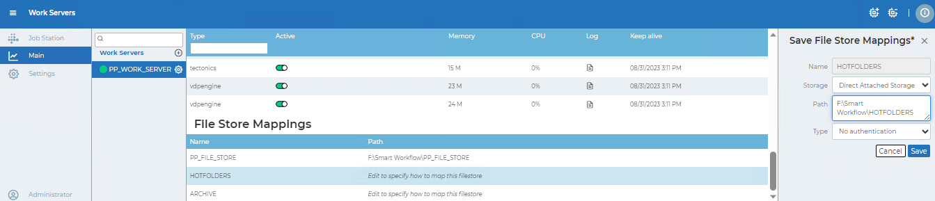 - Edit the locations for HotFolders and archive mappings to reflect the new file store paths you previously configured.