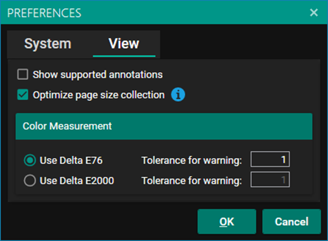 You can change your preferences under the view menu. Here you can choose whether to calculate Delta E using the CIE 1976 standard or the CIE 2000 standard. You can also choose your tolerance for the out of gamut warning to be triggered: