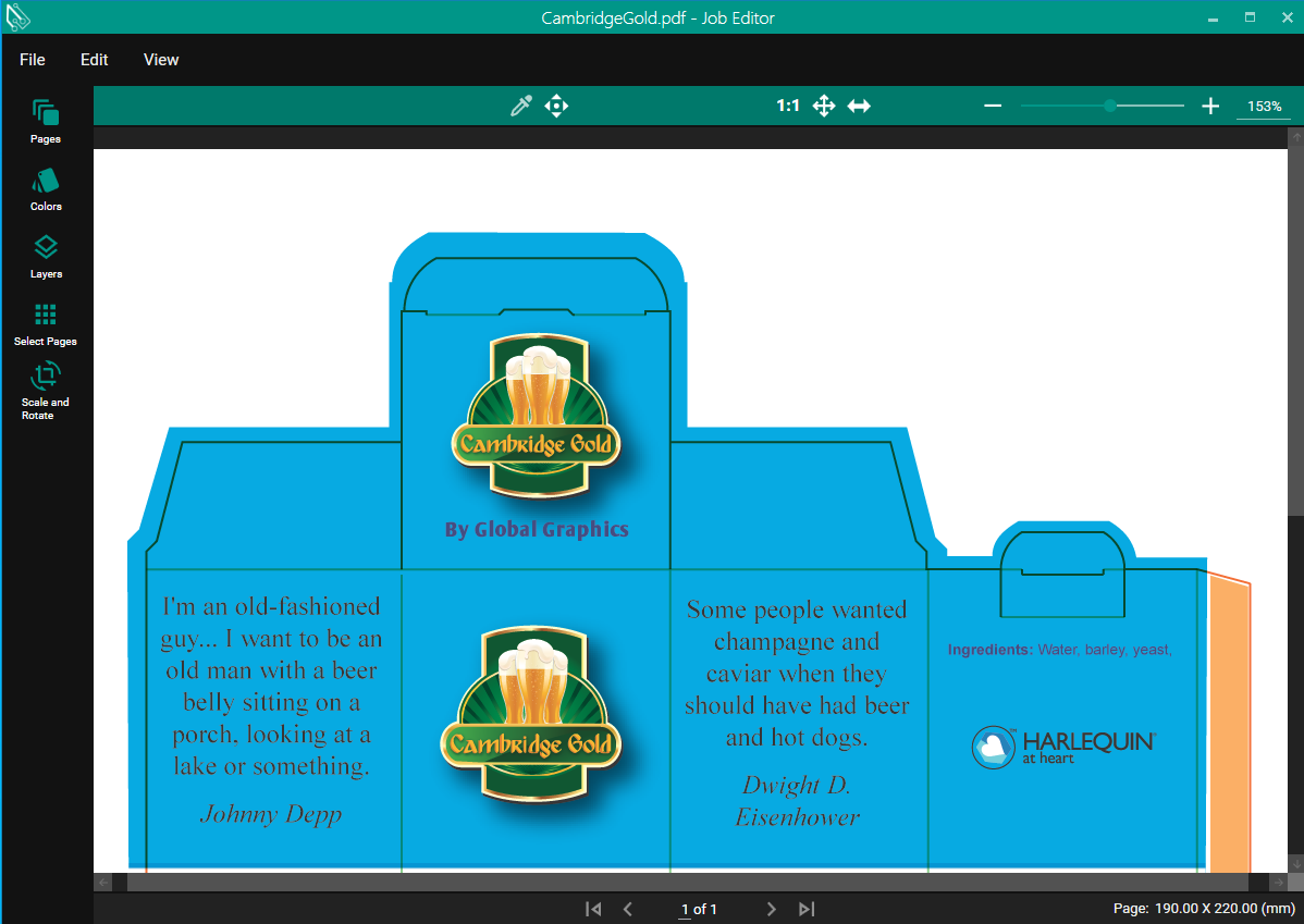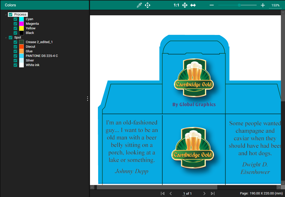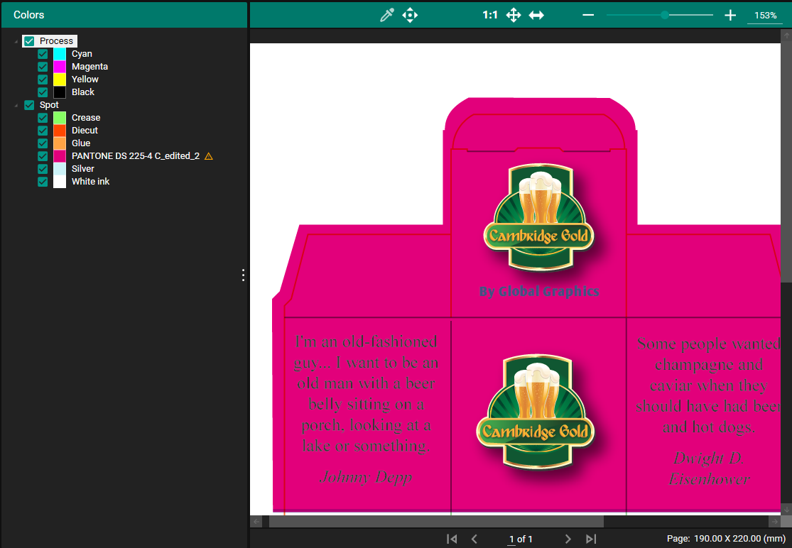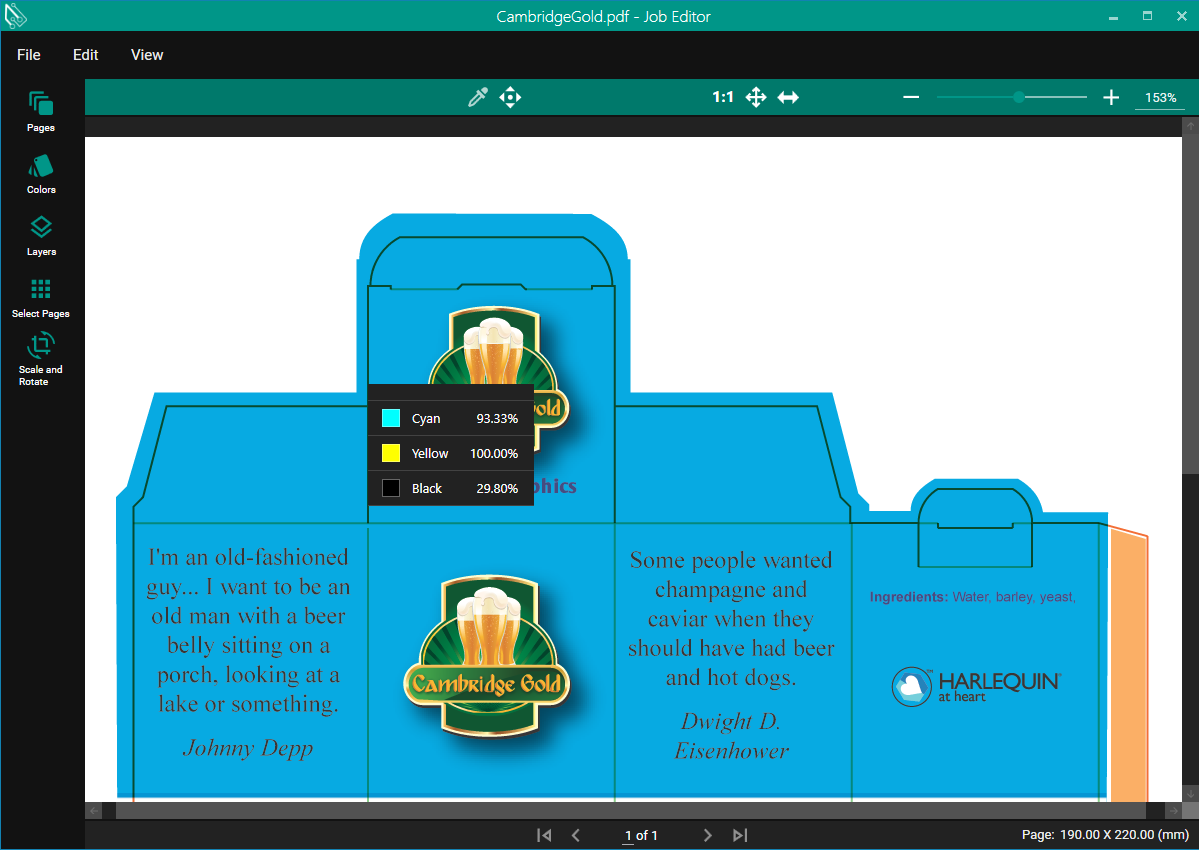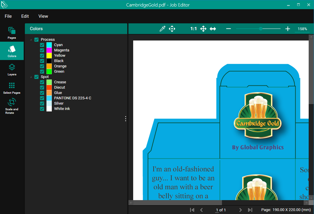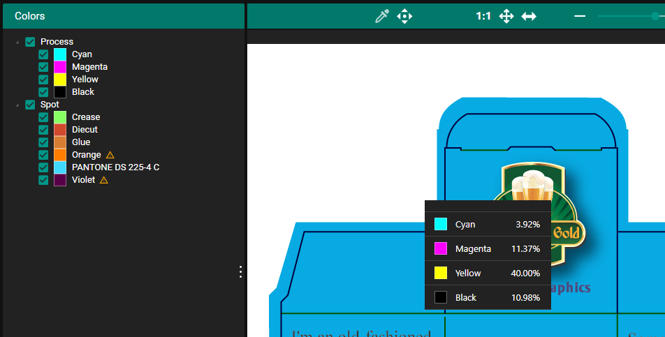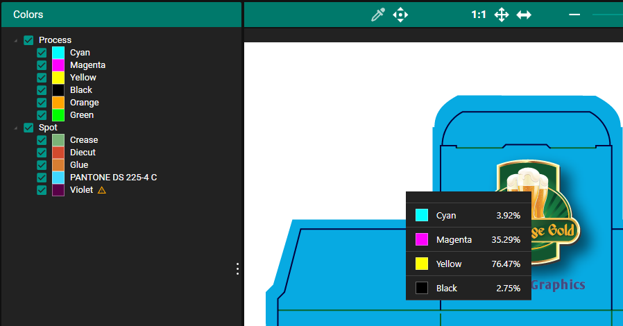 In the Color Tab you can see what Colors are specified in the PDF Job both Process and Spot Colors. Process Colors that are supported are CMYK, CMYKOV and CMYKOG.