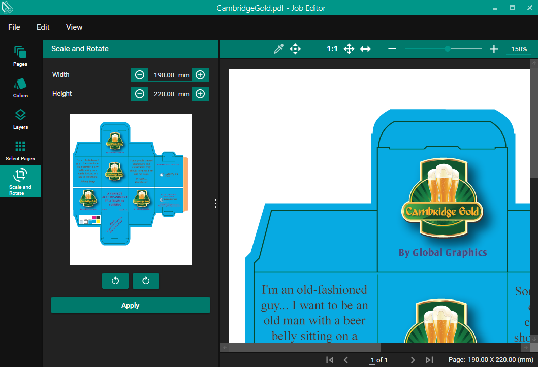 The two buttons below the document preview will rotate the preview by 90 degrees clockwise or anticlockwise. When you are happy with the orientation of the preview, pressing Apply will commit that rotation to the real job.