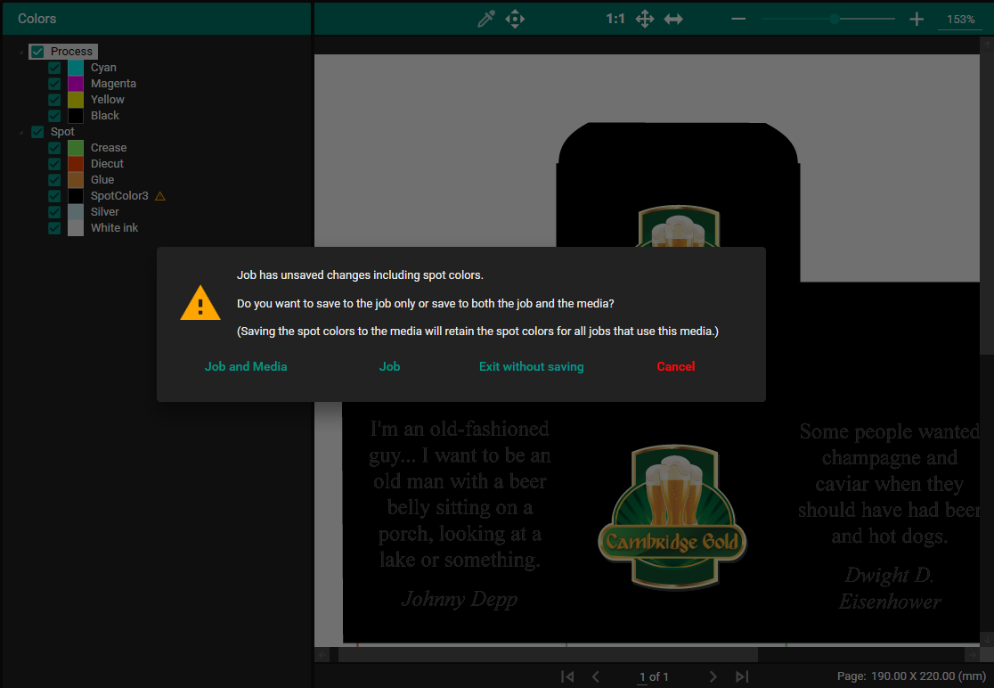 - Job and Media : Save the edited spot, assign the job, and save it to the Spot Overrides in the Media (SMD). Saving the spot colors to the media will preserve them for all jobs utilizing this media.