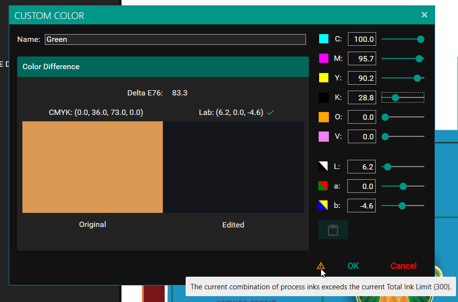 If "Allow TIL to be exceeded in Custom Color" is disabled in SPC's Engineer pane, then the OK button will be disabled when this warning appears - otherwise it will remain enabled.