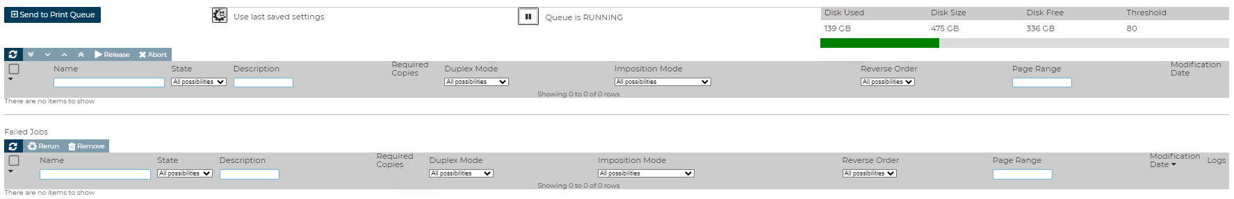 With the queue in a running state, jobs are sent straight through this queue to the printer. While this remains to support some legacy functionality. It can be useful to introduce another QA stage or to remote manage jobs feeding the printer.
