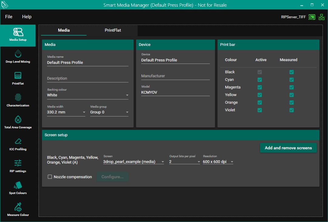 Print Bars | This section allows the user to select which ink channels should be printed and measured, and which should be ignored. Channels marked as ignored will not be used in Smart Media Manager (SMM) for dot gain correction, ink limiting, gray balance, or ICC profiling. However, these channels must still be included during the drop level and pinning stages. Ignored channels are excluded from both PrintFlat calibration and ICC profiling. In Smart Print Controller (SPC), ignored channels are excluded specifically from ICC profiling. |