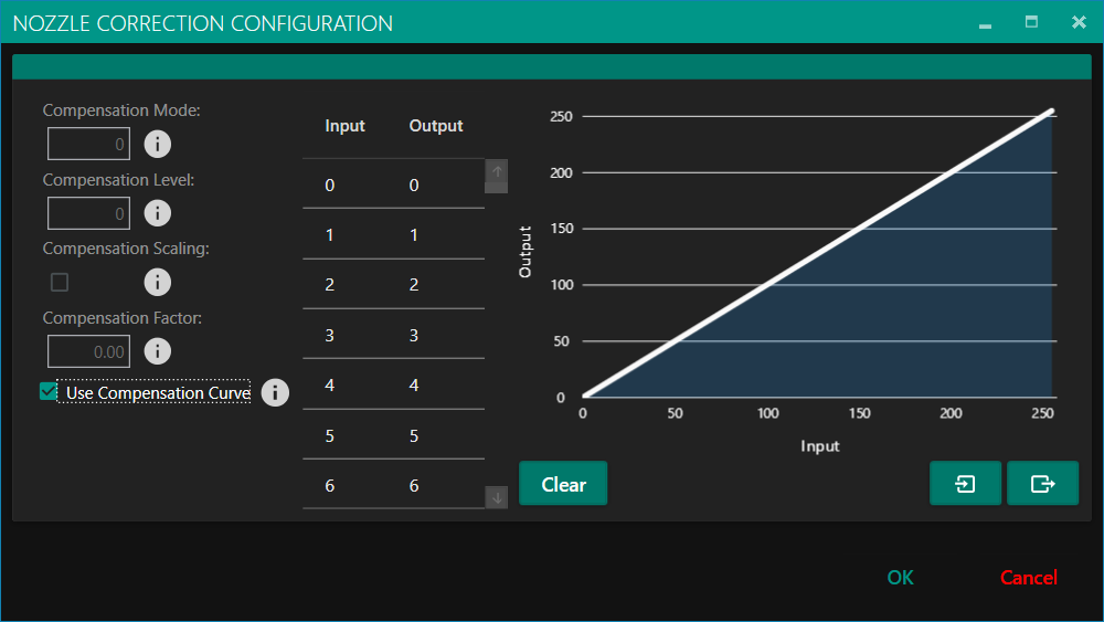 Nozzle Compensation Enabled | Enabling this option allows you to open the Nozzle Correction Configuration window to set up and manage nozzle compensation settings (see below). |