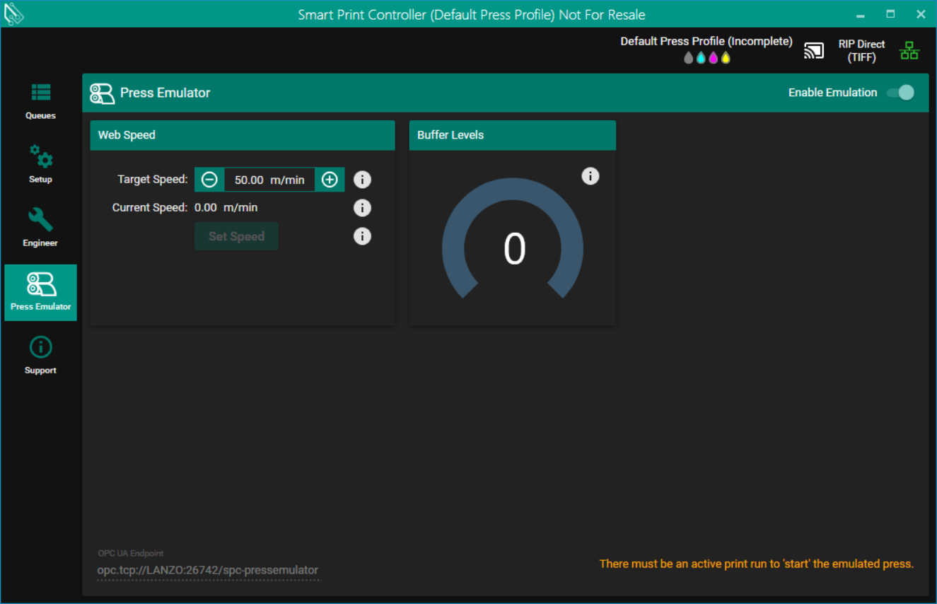 Jobs in the Print Queue will be processed as normal but sent to a emulated press device (so no output produced) configured for a custom output speed. This allows the press’s buffer levels to be monitored in a safe and controlled environment.