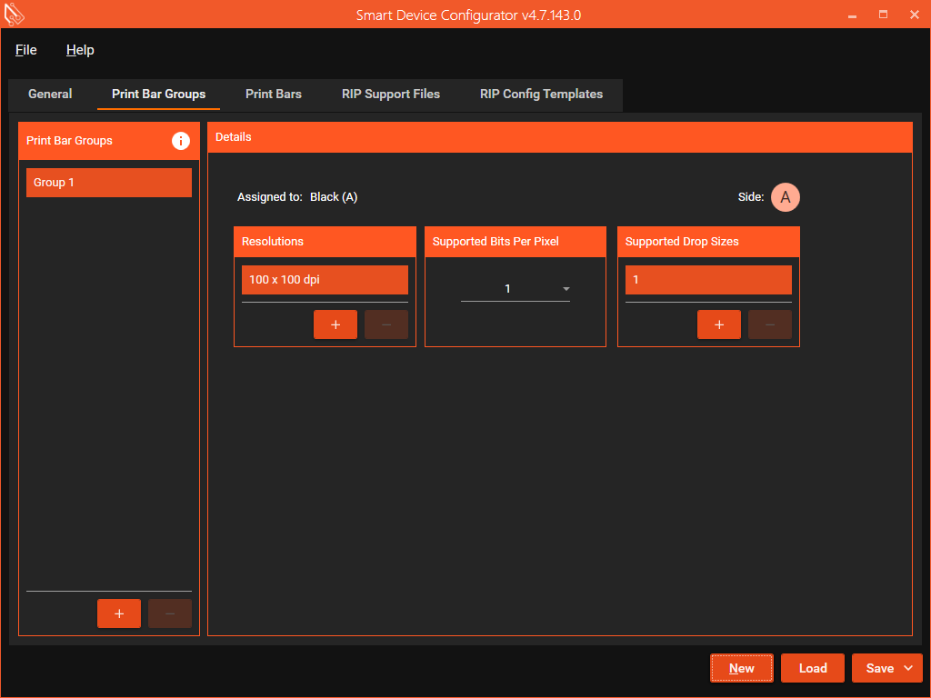 If different RIP Server configurations are required (e.g. 600x600dpi and 1200x1200dpi) these would be defines as 2 different Print Bar Groups