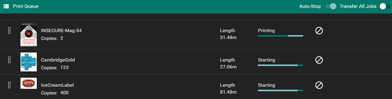 Start - Start the print run. Any job appearing in the Print Queue is automatically sent to the RIP Server(s), ordered top to bottom.