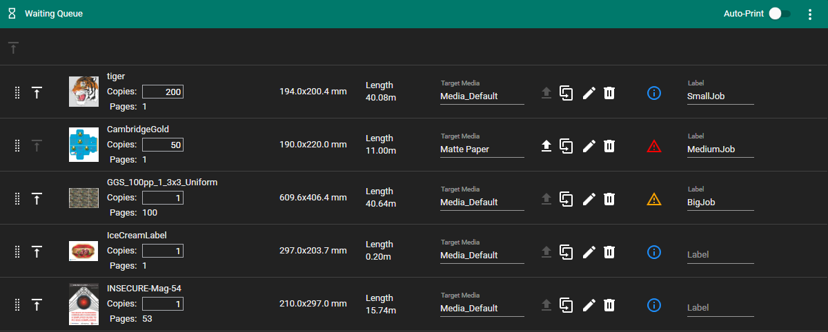 This view option provides more information about each job and allows you to set a Label directly in the queue, or set the Active Media to be the same as a job's Target Media.