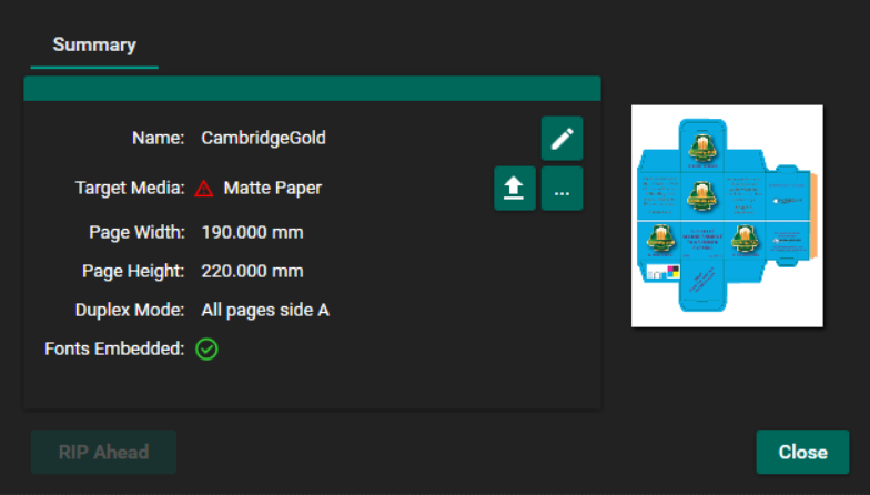 The rightmost button lets you change the Target Media of the job. If you change the Target Media and press Close, the job will begin preprocessing again.